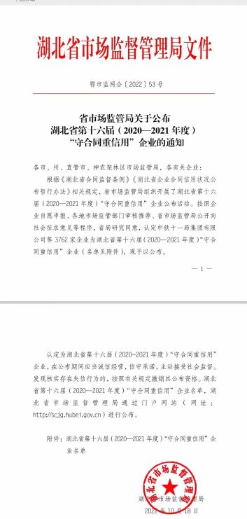 根據(jù)《湖北省合同監(jiān)管條例》《湖北省企業(yè)合同信用狀況公布暫行辦法》相關規(guī)定,省市場監(jiān)督局組織開展湖北省第十六屆(2020-2021年度)“守合同重信用”企業(yè)公布活動,按照企業(yè)自愿申報,各地市場監(jiān)管部門推薦,省市場監(jiān)督局公開向市場征求意見等程序,我司被認定為湖北省第十六屆“守合同重信用”企業(yè)稱號!
