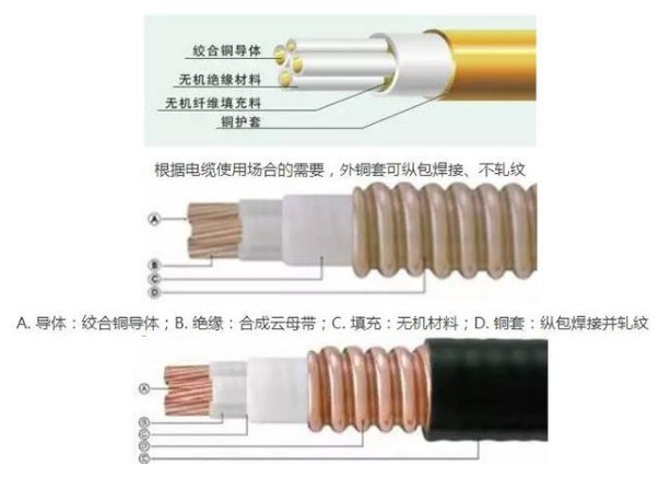 A. 導體:絞合銅導體;B. 絕緣:合成云母帶;C. 填充:無機材料;D. 銅套:縱包焊接并軋紋